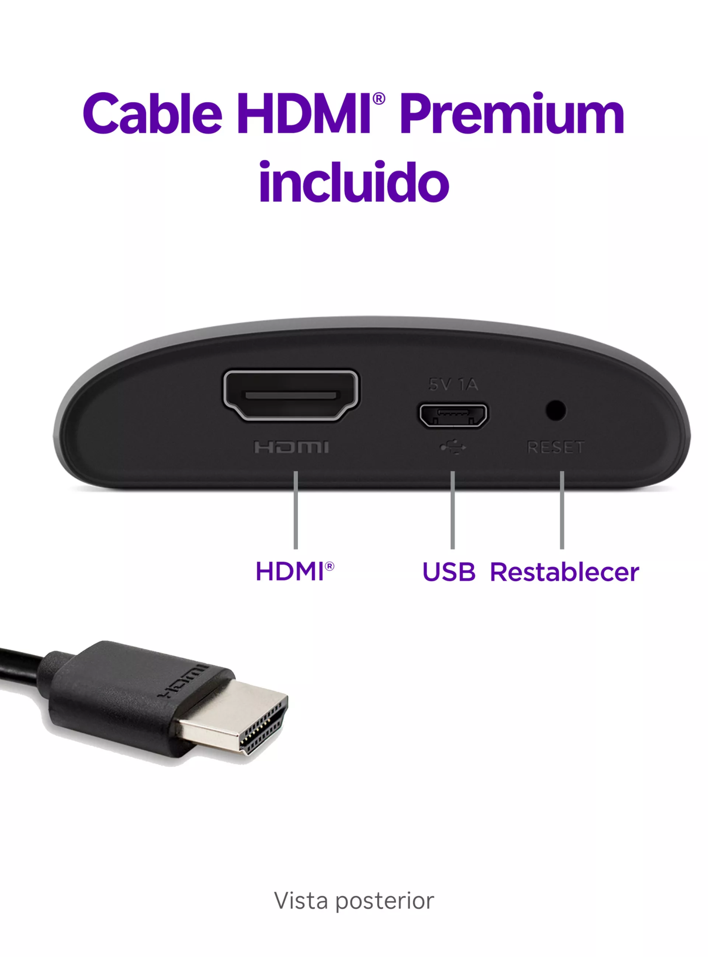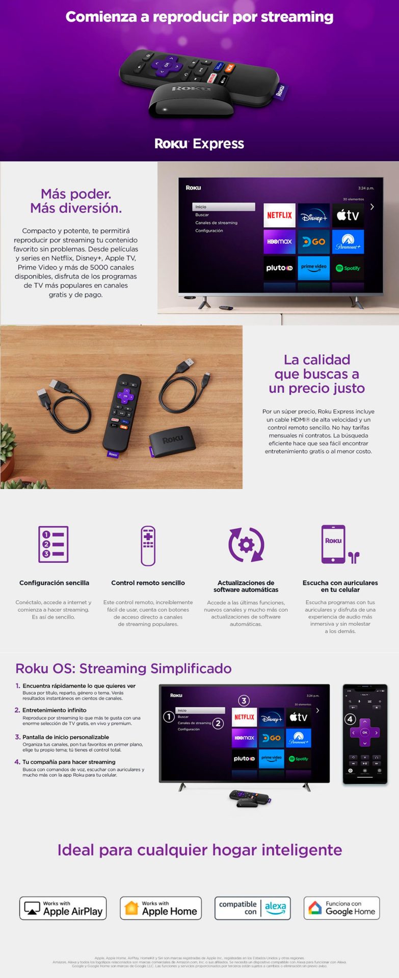 Streaming más sencillo: Con una configuración rápida y una experiencia sencilla en pantalla, Roku Express es perfecto para nuevos usuarios, pero es lo suficientemente potente como para enamorar a los más experimentados. Para comenzar, solo conéctalo al TV con el Cable HDMI® de alta velocidad que viene incluido y conéctate a internet. Paga solo lo que deseas: Roku Express incluye un Cable HDMI® de alta velocidad y no hay cargos mensuales por el equipo. Con cientos de canales gratuitos que puedes acceder, tendrás suficiente contenido para ver sin gastar de más. Control remoto sencillo: El control remoto es simple y cuenta con controles intuitivos y botones de atajo a canales populares de streaming, además, es fácil de usar y esta diseñado para que quepa en la mano. Entretenimiento ilimitado: Reproduce por streaming casi todo, incluso TV gratuita, noticias en vivo, deportes y más. Nunca te pierdas los eventos más comentados, los programas galardonados, los últimos éxitos de taquilla y más. Es sencillo hacer streaming de lo que amas y gastar menos en la factura del cable; tendrás acceso a más de 100,000 películas y episodios de TV en miles de canales de pago o gratuitos. La aplicación móvil gratuita de Roku: Convierte tu dispositivo iOS® o Android™ en tu compañero de streaming definitivo. Utiliza la aplicación móvil como un control remoto secundario para el dispositivo Roku, busca usando el teclado, disfruta de escucha en privado e incluso transmite fotos y más en el TV.